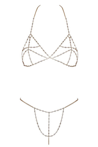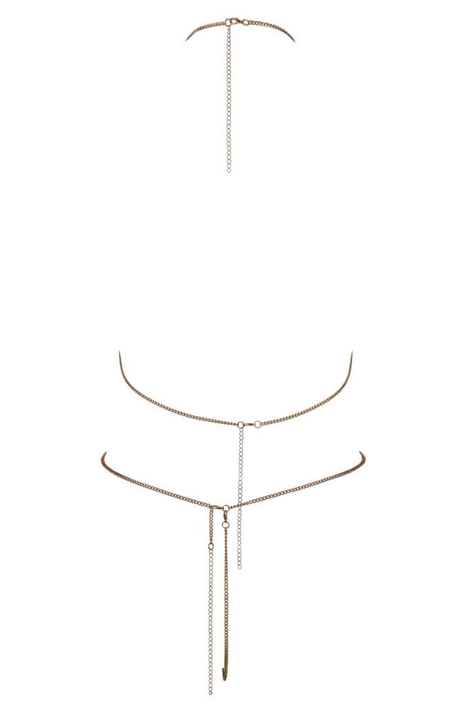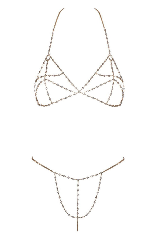 A glamorous set with a crotch chain! The gold-coloured chain bikini from Cottelli ACCESSOIRES is made up of a bra and string. There are shimmering rhinestone chains over the breasts and pubic area. There is also a stimulating chain that goes over the crotch right up to the top of the buttocks. The halterneck chain, back chain and string chain can be adjusted with the snap hooks. It can be worn on its own as lingerie for an erotic look or stylishly combined with swimwear and tight-fitting outfits – this glamorous chain bikini will always be a captivating eye-catcher!