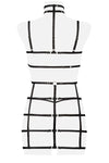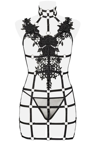 • Design: The set features a captivating harness with adjustable straps, a choker, and multiple straps adorned with crochet lace. A matching thong is included to complete the look.