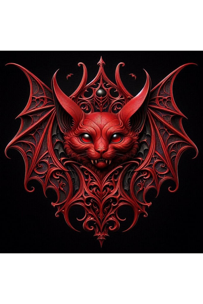 Step into a world of gothic myth with the Crimson Familiar Print. This highly stylized piece features a creature that is a striking fusion of a cat and a bat, rendered in a dramatic crimson red against a solid black background. Its feline head, with glowing red eyes and sharp fangs, gives it a fierce, yet captivating look.