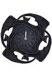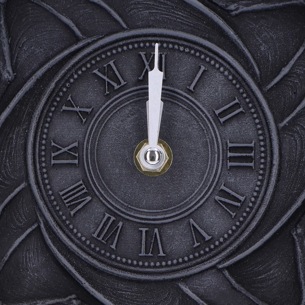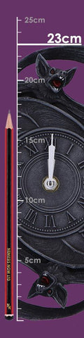 This clock combines classic functionality with gothic aesthetics. It has two traditional clock hands and is marked by Roman numerals, which lend an old-world feel to its design. The clock operates on a single AA battery, ensuring a seamless, low-maintenance experience.