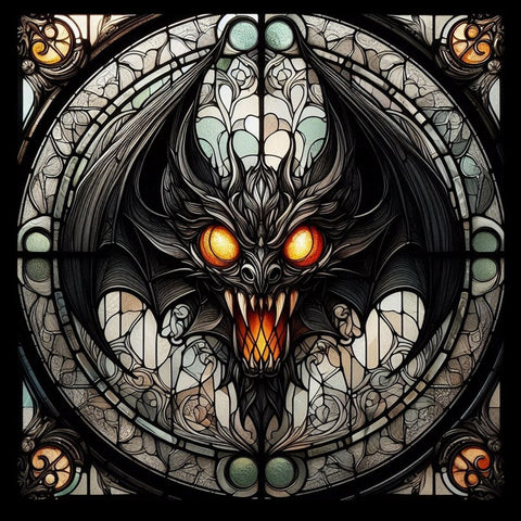 This art print is a dramatic and intense piece in the style of stained glass. The Fangs of the Night Print features a powerful, forward-facing image of a monstrous bat-like creature, framed by an intricate, ornate design.