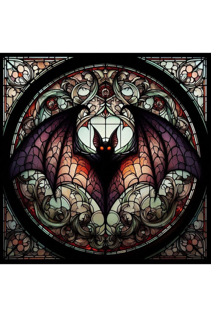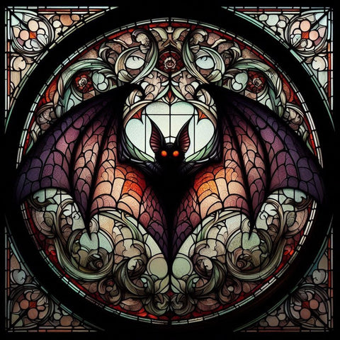 Surrounding the central bat is an intricate, symmetrical border with swirling patterns resembling foliage and abstract shapes. This ornate frame is rendered in a muted palette of off-whites, grays, and soft greens, providing a subtle backdrop that contrasts with the intense colors of the bat. The entire composition is defined by thick, dark lines that complete the illusion of a grand stained glass window.