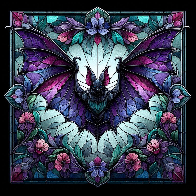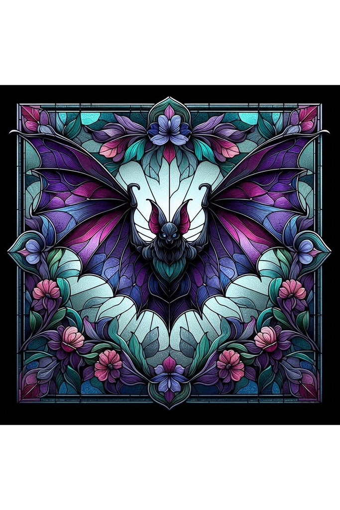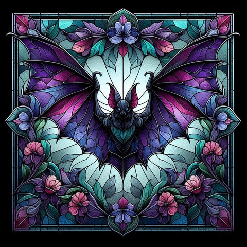 This art print transforms a mysterious, nocturnal creature into an elegant work of art. The Violet Bat Print is a striking, square piece created in the style of stained glass. It features a stylized bat in the center, framed by a beautiful border of flowers and foliage.