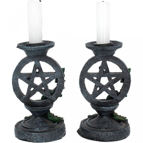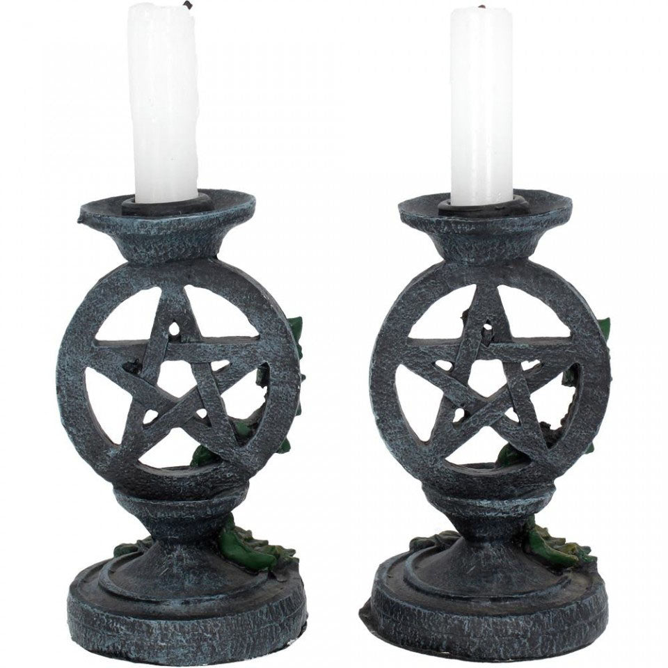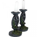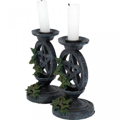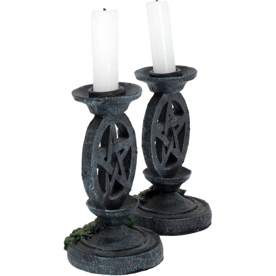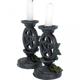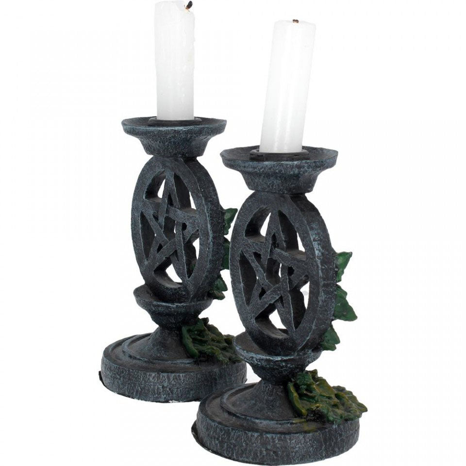 Crafted from high-quality resin and meticulously hand-painted, each candlestick is a testament to exceptional craftsmanship. The intricate design features a pentagram encircled by a delicate ivy motif, symbolizing growth, life, and protection. The aged finish adds a touch of antiquity, making these candlesticks feel like treasured heirlooms.