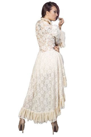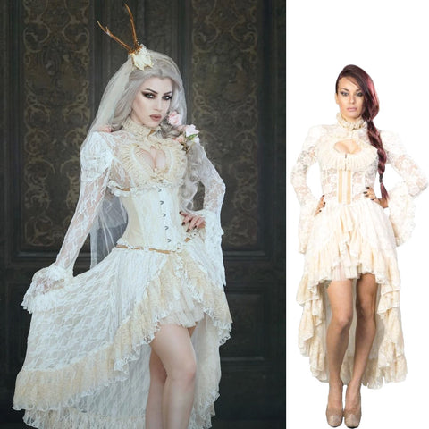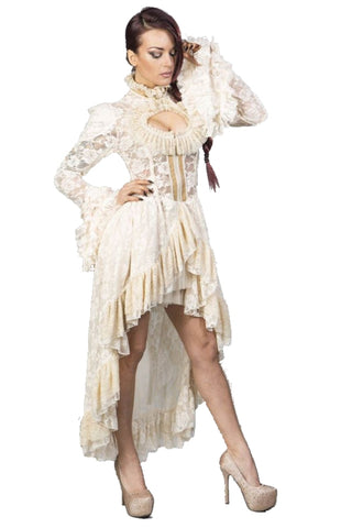 This beautiful long length cream lace long sleeved Victorian Gothic jacket / dress has double tier flared lace sleeve cuffs, a keyhole cut out on the upper chest with dark cream lace trim around this and the high neck collar which has a band of beige faux leather with cream braiding detail. This faux leather and cream braiding is also featured on either side of the front zip fastening. The jacket flares out below the waist in a waterfall style with a full length lace train section at the back and shorter length lace ruffles at the front. The lower edges of the jacket are trimmed with a darker cream lace while the main body of the jacket and skirt section is a lighter cream. A beautifully elegant item to add to your steampunk wardrobe.
