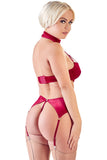 Red like love - not just for Christmas! 3-piece suspender set made up of an underwired bra, suspender belt and string. All pieces are made out of red velvet with gold-coloured metal details. The underwired bra is slightly padded. It has 5 fancy cleavage straps that go up to a choker with button fastener and can be adjusted for a comfortable fit. The suspender belt has a clasp at the front and 4 adjustable suspender straps.