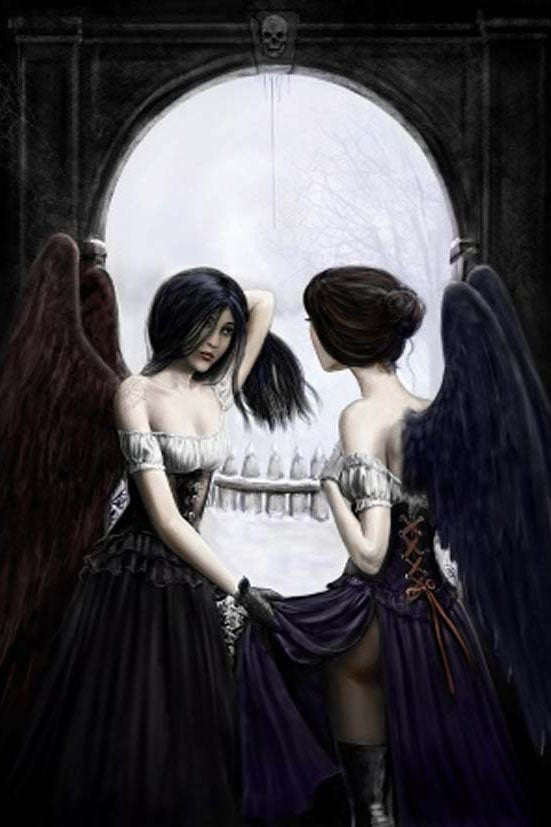 Beautiful Card with the artwork of Dashinvaine, featuring two gothic angels in an archway facing each other, with snowy scene beyond, made to look like the illusion of a skull. The card is blank inside for your own message. The emvelope features a dragon and ivy design.