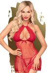 Show what you have - your lover's libido will go crazy! The playful babydoll impresses with a combination of delicate lace and a fine Point d'Esprit style mesh. The highlight of the top is the deep keyhole neckline, which beautifully highlights your breasts - the cleavage is also adorned with a small bow. The halterneck straps ensure a good fit and create a deep neckline at the backside. The look is completed with a hem made of delicate eyelash lace and lacing on the back. The set also includes a delicate lace string to match the babydoll.