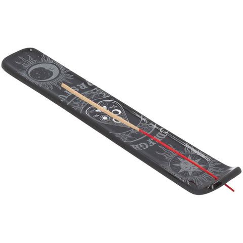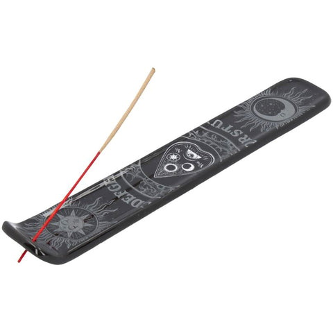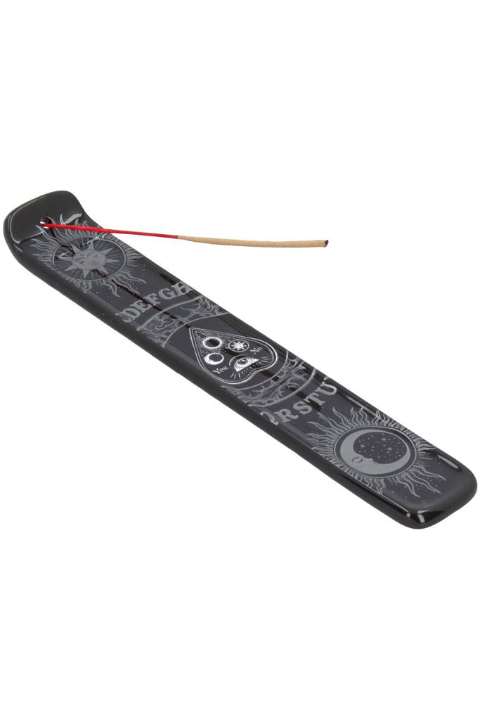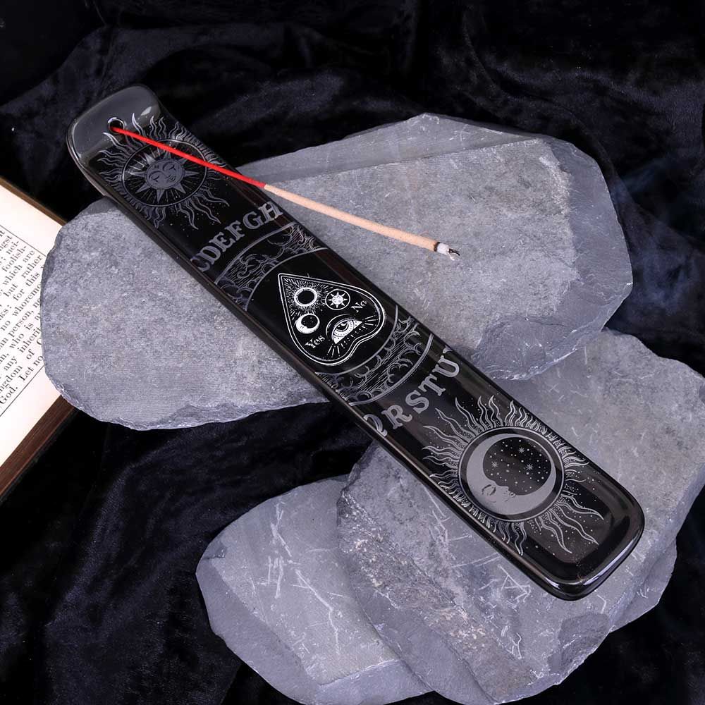 This incense holder brings occult vibes into any room. Spirit boards have long been one of the most powerful occult tools there is. The background is black and has the alphabet marked out in a circle. A planchette sits in the centre and features the words YES and NO, below a small sun and moon, while the top and the bottom of the holder feature larger, more decorative suns and moons.
