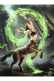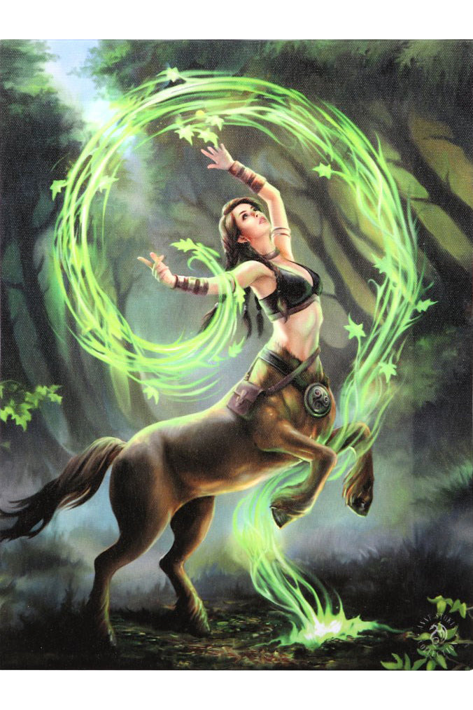 Renowned fantasy artist Anne Stokes brings her talent to life in this stunning canvas picture. Measuring 19cm x 25cm, it depicts a powerful centaur sorceress. Half-human, half-horse, she embodies the harmonious connection between humanity and the natural world. With outstretched hands, she calls forth swirling tendrils of earth magic from the forest floor, a testament to her mastery over the element that sustains all life. The intricate details of the scene, from the determined expression on the sorceress's face to the vibrant hues of the earth magic, capture the essence of nature's raw power and the sorceress's ability to tap into it.