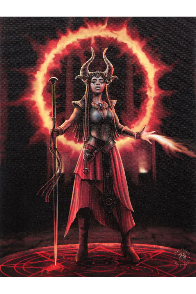 Renowned fantasy artist Anne Stokes brings her signature style to life in this stunning canvas picture. Measuring 19cm x 25cm, it features a powerful horned sorceress standing before a blazing ring of fire. The intricate details of the scene, from the sorceress's determined expression to the flickering flames, capture the raw power and allure of this primal element.