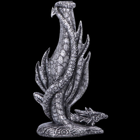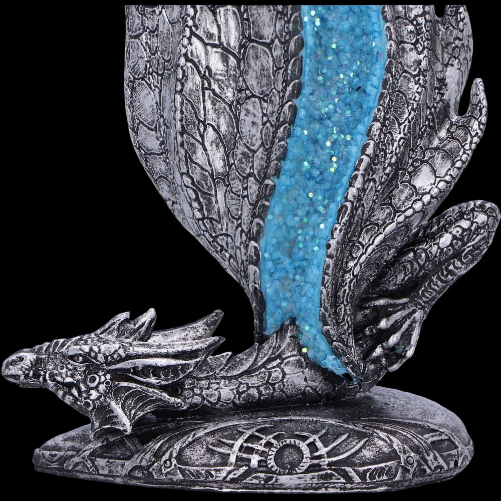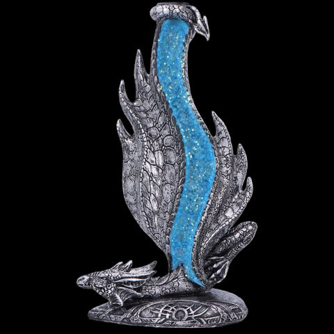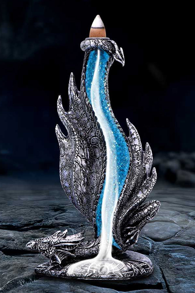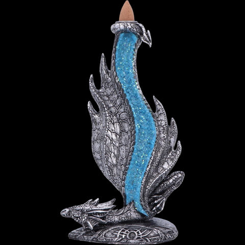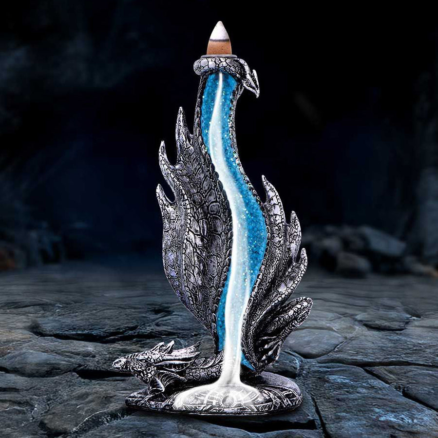 Elemental Elegance Encased in Dragon Wings. The Dragon Flame Backflow Incense Burner represents an exquisite fusion of fantasy artistry and functional design. This magnificent silver dragon wing design, with its metallic scaled texture and striking blue crystalline channel, transforms ordinary incense into a mesmerizing spectacle. When a backflow cone is placed at the top, smoke cascades down the vibrant blue pathway, creating the illusion of mystical energy flowing between protective dragon wings.