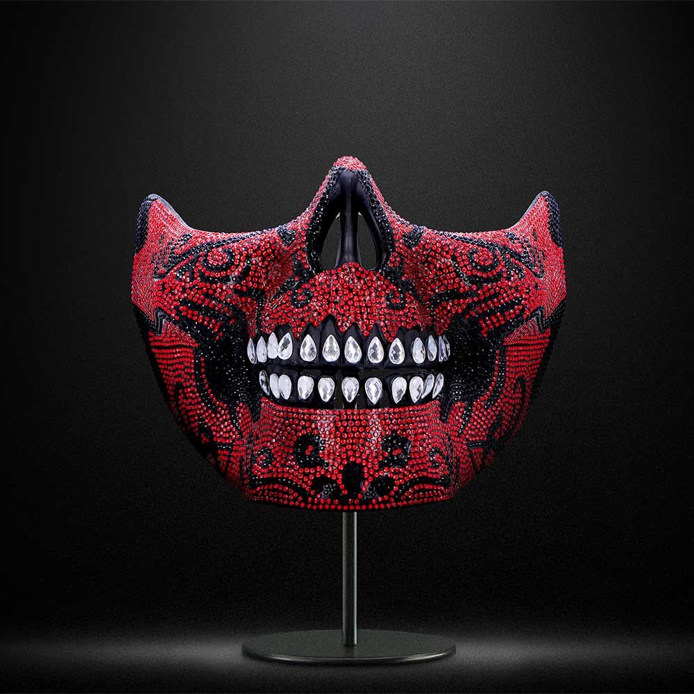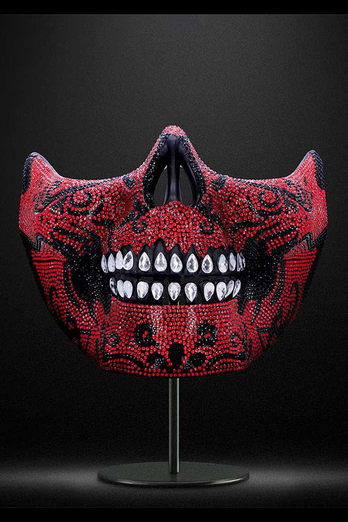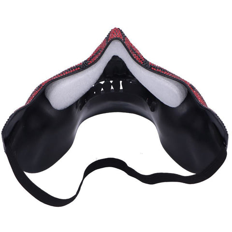 Crafted with care, the mask is adorned with a complex arrangement of shimmering crystals and metallic stones. The deep red tones bring richness and passion, while the black accents add depth and contrast—resulting in a powerful, light-catching display from every angle.