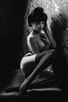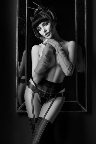 Introducing our Black Crotchless Tights with Bordeaux Pin Striping, Faux Suspender Belt, and Brief – Adorned with a faux suspender belt and brief detailing, they offer a daring yet sophisticated look. Perfect for adding a touch of glamour to any outfit or intimate occasion. Packaged in our sleek black Secret branding, they’re ready to elevate your style with unmatched sophistication and charm!
