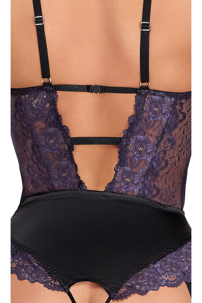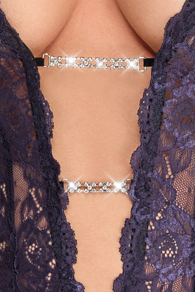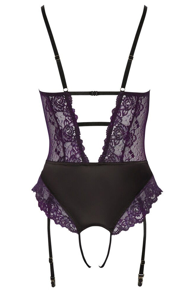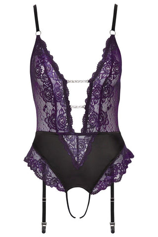 Super seductive crotchless body! Crotchless suspender body from Cottelli LINGERIE made of beautiful purple-coloured lace and black details. It is super soft and stretchy for high comfort. The plunging neckline features two glittering chains as a special eye-catcher. The plunging back cut-out offers two stretchy straps, of which one is adjustable. The straps and suspenders are also adjustable.