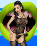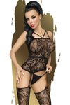 This bodystocking sparks magic with it's delicate fabric and beautiful floral pattern. Crossed strap details draw attention to your cleavage and back. The suggested stockings flatter your legs and prove this mistress is ready to play. Finished off with a sexy panty for a final flare.