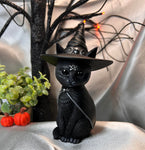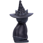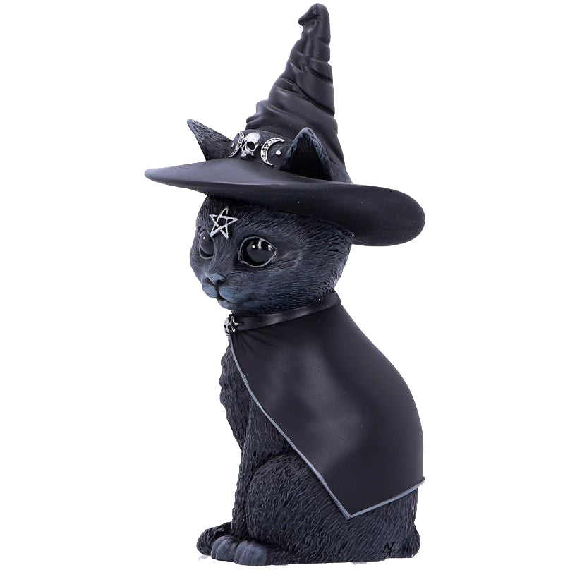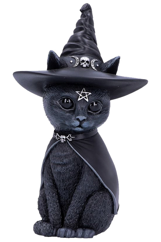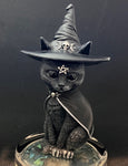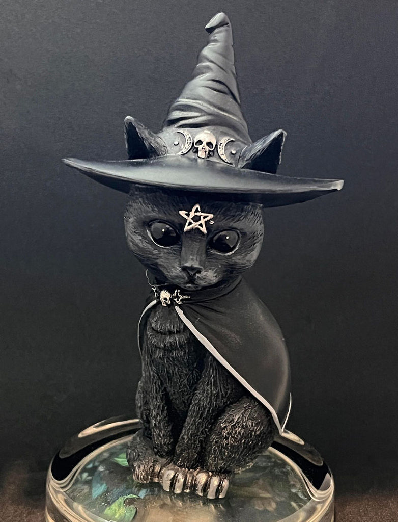 Purrah. This strange creature is the union of good and evil. As you look into its black eyes you notice that all is not as it seems, darkness resides within. The cat appears to be channelling the spirit of the witch, encapsulated by a large pointed hat and smooth cape. The cat is decorated in ornate silver detailing and occult symbology. Cast in high-quality resin and carefully hand-painted this figurine is likely to be the cutest occultist you've ever seen. Alongside Owlocen, the Witch Owl, this amalgamation of horror and delight will make the perfect addition to any feline fanatic's collection.