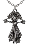 A handmade pewter pendant inspired by the corn dollies. Alchemised to perfection featuring a skull face and pentagram tie.