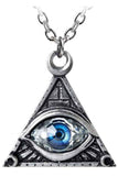 A pewter pyramid triangle set with a bright blue-pupiled Swarovski crystal eye.