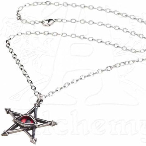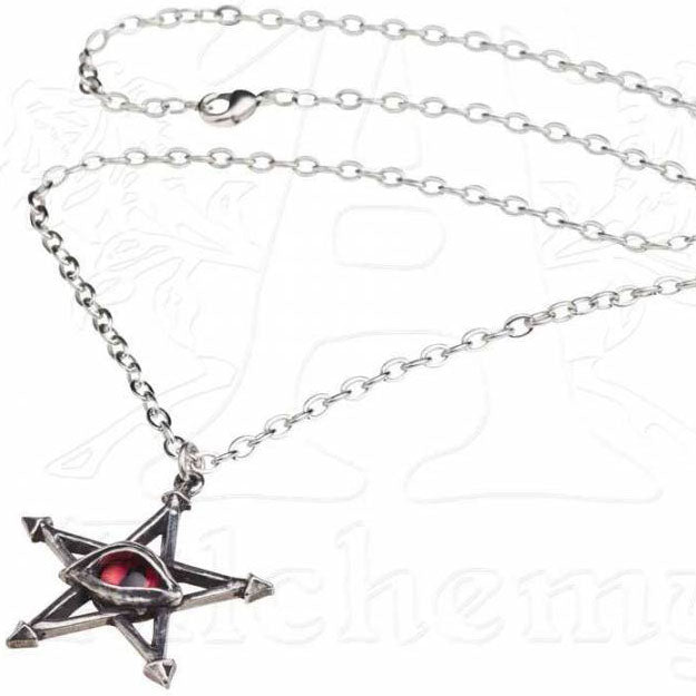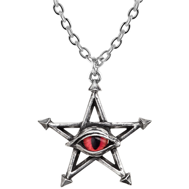 An Evil Eye amulet of great power enhanced by the underlying magical pentagram, to ward-off unmindful, malevolent curses from an erudite adversary. A red, synthetic eye of a snake, set into a cast pewter human eye mounted on an arrow-headed pentagram.