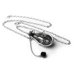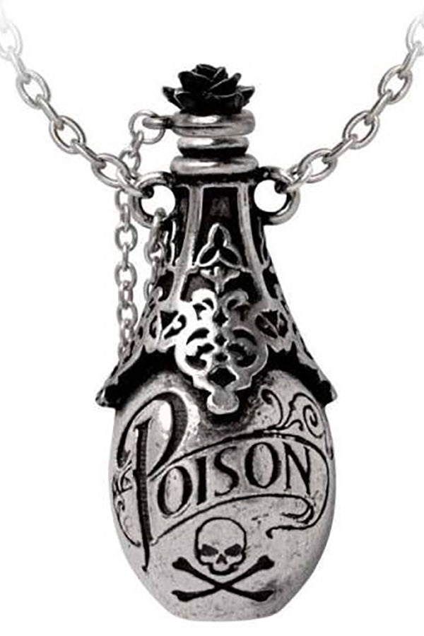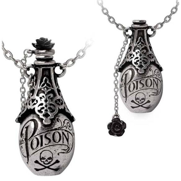 An active woman's discreet solution to a troublesome 'encounter', as exemplified by the infamously licentious, incestuous and murderous c16 femme fatale noblewoman, Lucrezia Borgeia. An extremely tactile piece! A talking point with all you meet! A bottle inspired pendant with the etched word 'Poison'. Complete with a removable magnetic bottle stopper and black rose detail.