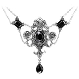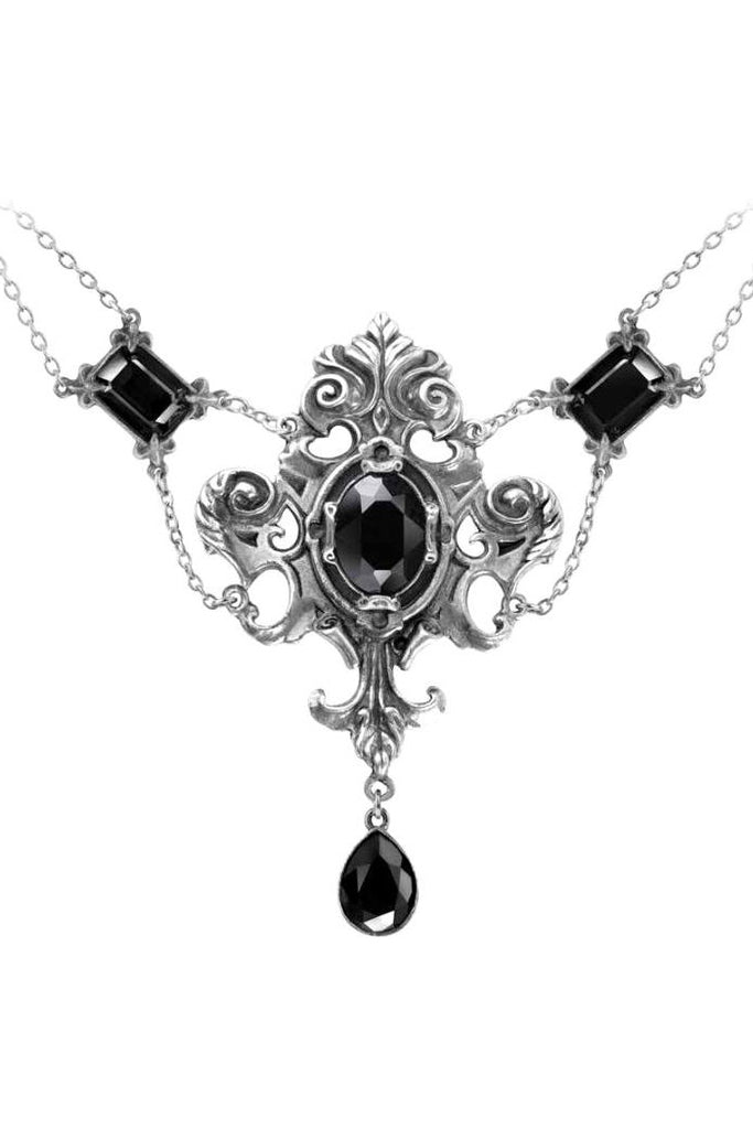 A pewter baroque-styled sculpted cartouche, flanked by matching stone-sets and finished with a crystal dropper. All set with black cut Swarovski crystals.