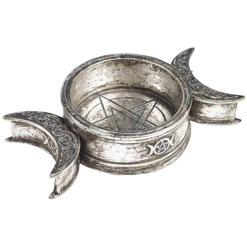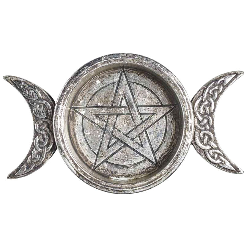 Hallowed altar to the goddess Cerridwen, cauldron of wisdom and vessel of the sacred flame, watched over by the horned crescents of the virgin and the crone. Add some magic into your home with this Pagan inspired trinket dish/ candle holder. This triple moon design will look impressive at your alter or make a perfect gift for a Wiccan loving friend.