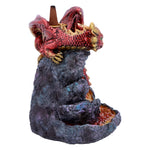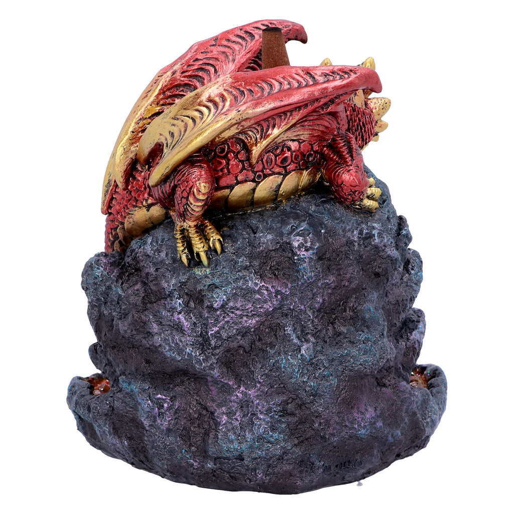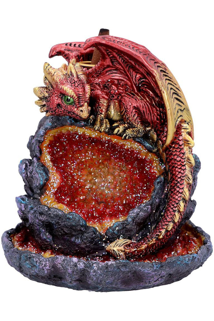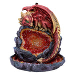 Brighten up your shelves with this beautiful Dragon! Leaning at an angle, this ruby geode is split down the middle, revealing the glistening ombre crystals within. A Dragon climbs over the top, guarding it jealously. Its tails curl possessively around the stones as it stares at any would-be thieves. Cast in the finest resin before being expertly hand-painted, this item is not your ordinary figurine. Between the Dragon's wings, a small incense cone can be placed making this both visually beautiful and practical.
