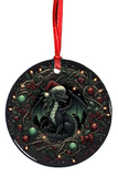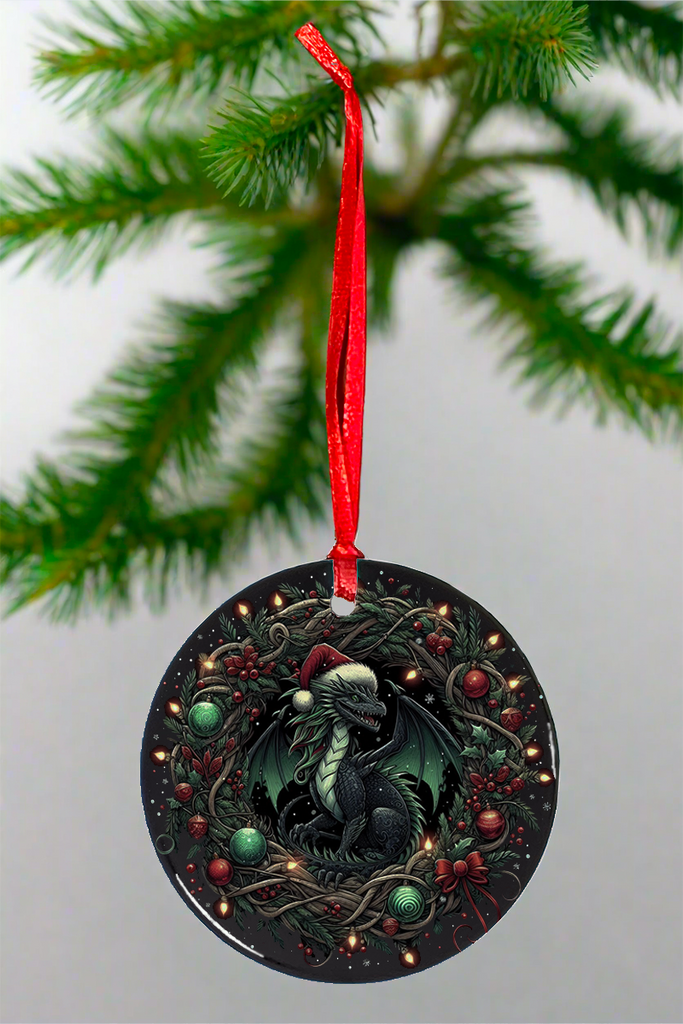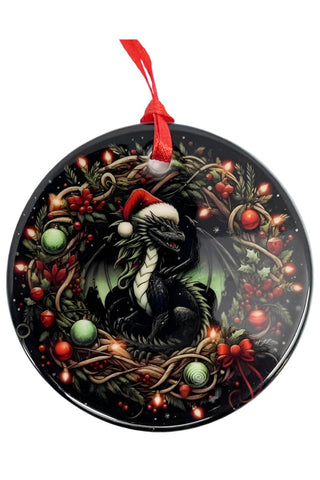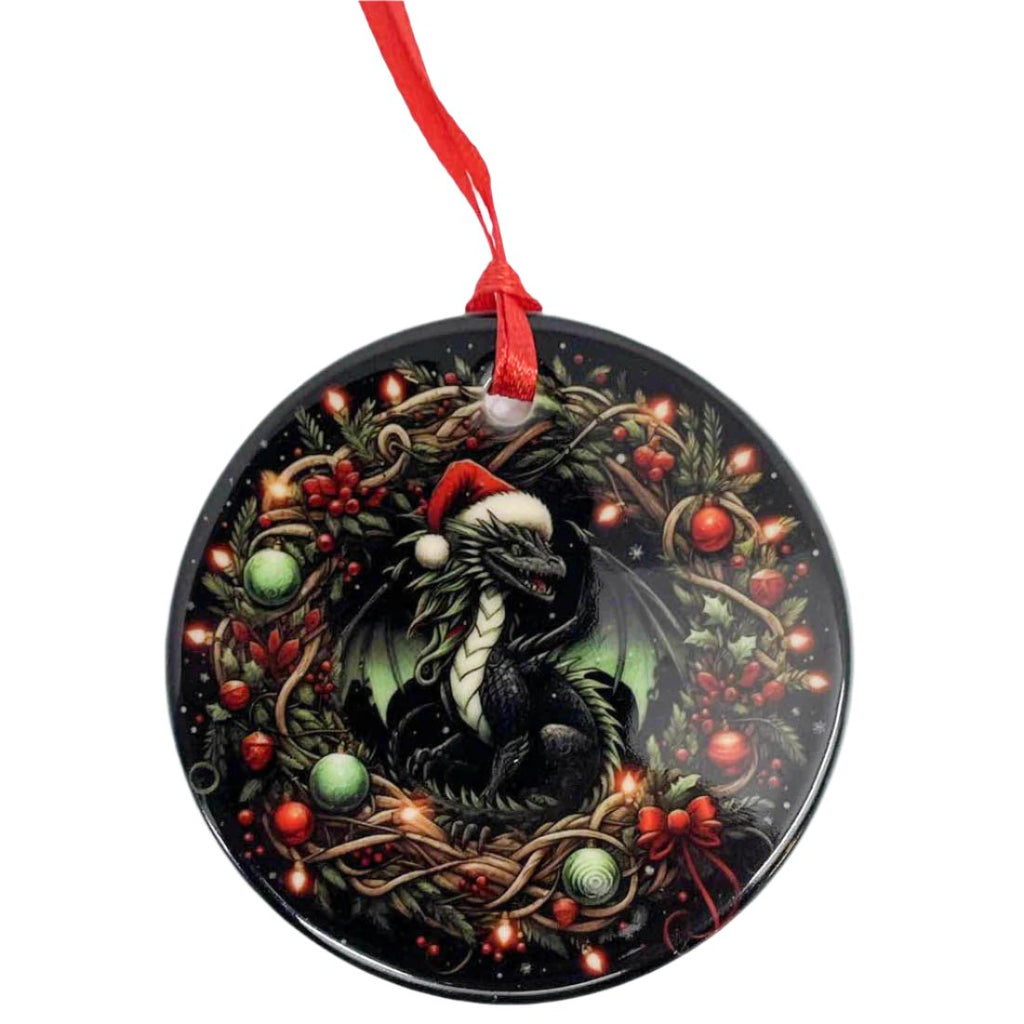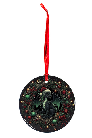 This round ceramic ornament features a magnificent black dragon at its centre, with a playful and charming twist: it's wearing a classic Santa hat. The dragon is beautifully framed by a festive Christmas wreath, complete with colourful baubles and twinkling Christmas tree lights. The design is double-sided, ensuring its captivating details can be seen from any angle on your tree.