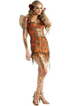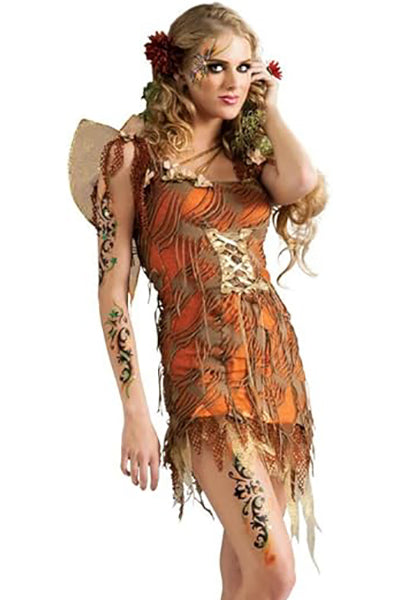 The dress, crafted in a vibrant orange hue, is adorned with a brown 'leaf' overlay that adds a touch of rustic charm. Delicate golden laces and straps accentuate the feminine silhouette, while the attached wings with their shimmering gossamer texture create a truly ethereal look.