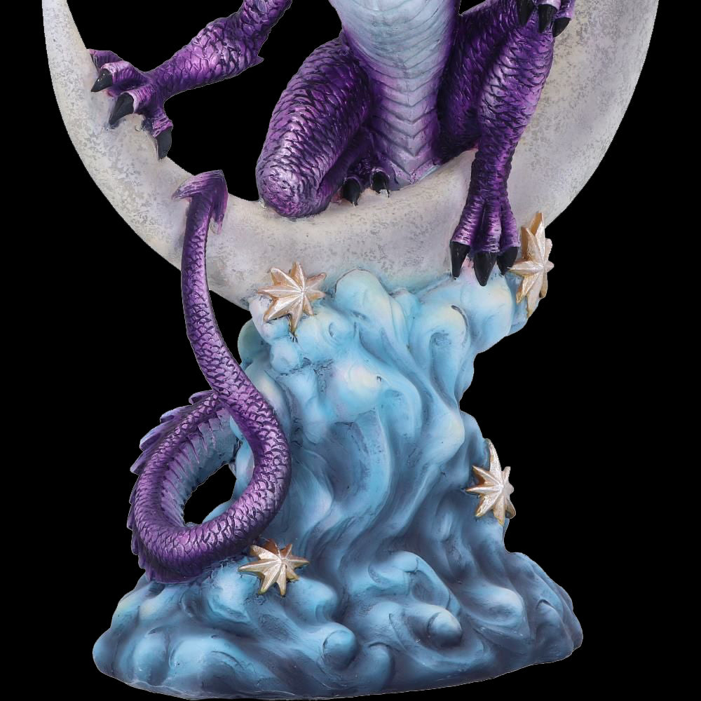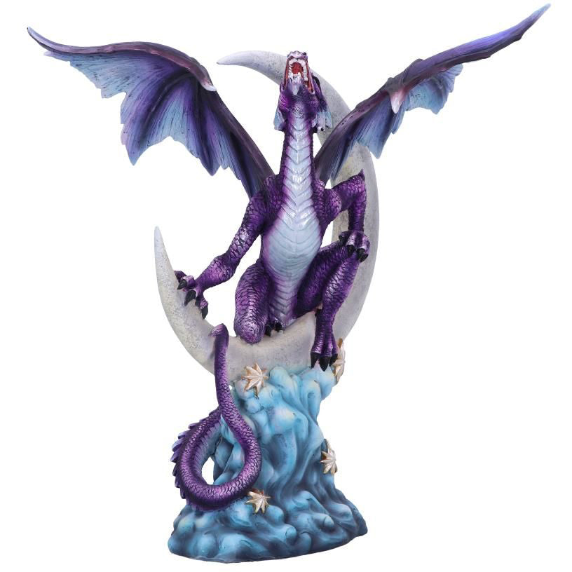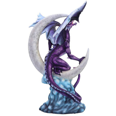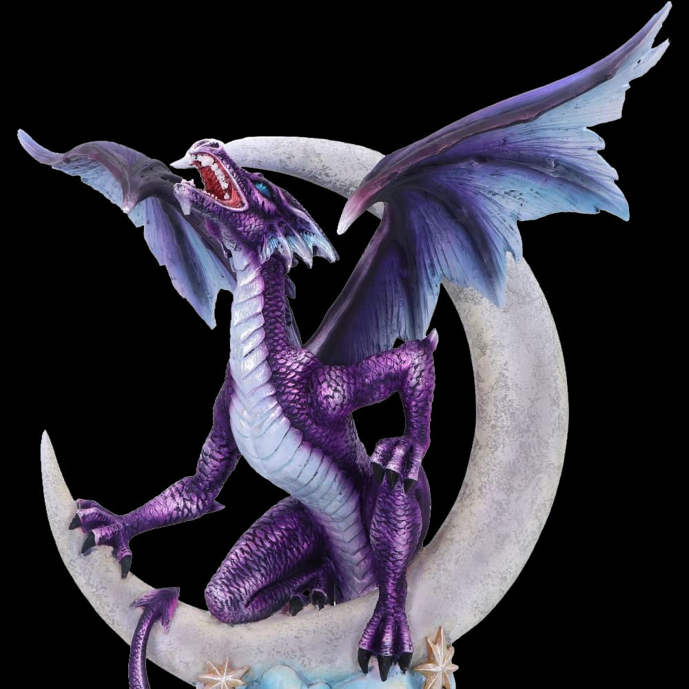 Crafted with intricate details and vibrant colors, this statue features a majestic purple dragon scaling the top of a crescent moon, creating a dramatic and eye-catching display. Cast in the finest resin before being carefully hand-painted.