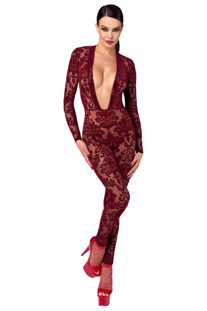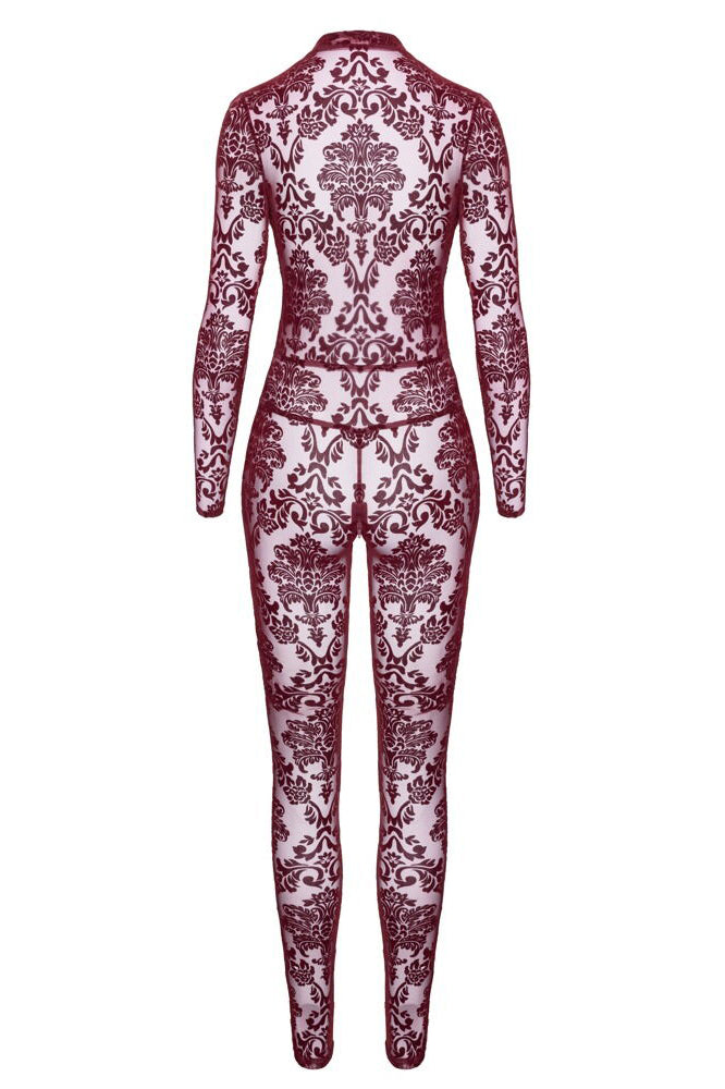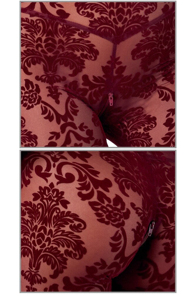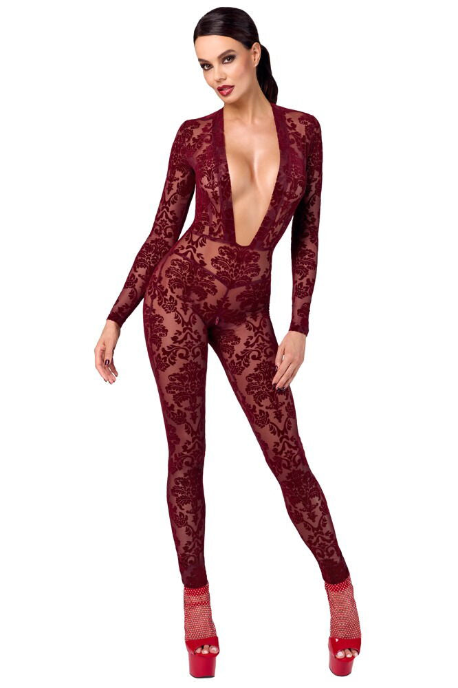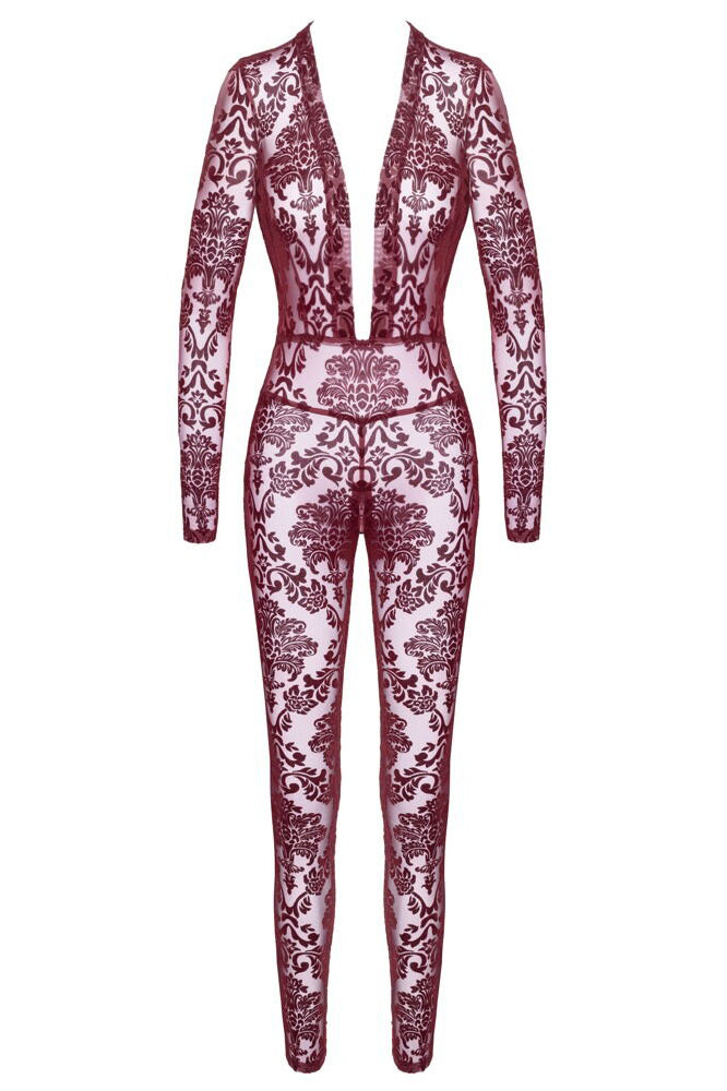 Transparent and velvety for sensual divas! The long-sleeved, skin-tight jumpsuit Kink Royal from Noir is in a breathtaking burgundy red colour. It is also decorated with velvet flock print as well. It is soft and stretchy for a very comfortable fit and freedom of movement. It is very low cut in the cleavage area and there is also a discreet zip over the crotch.
