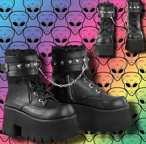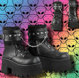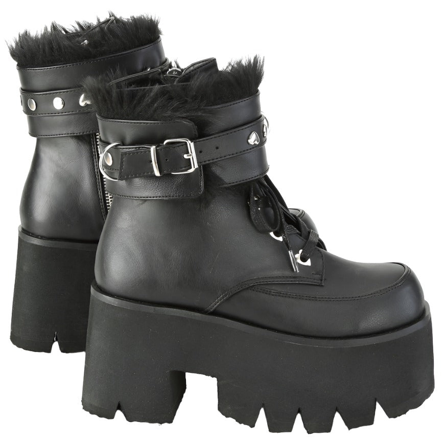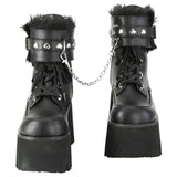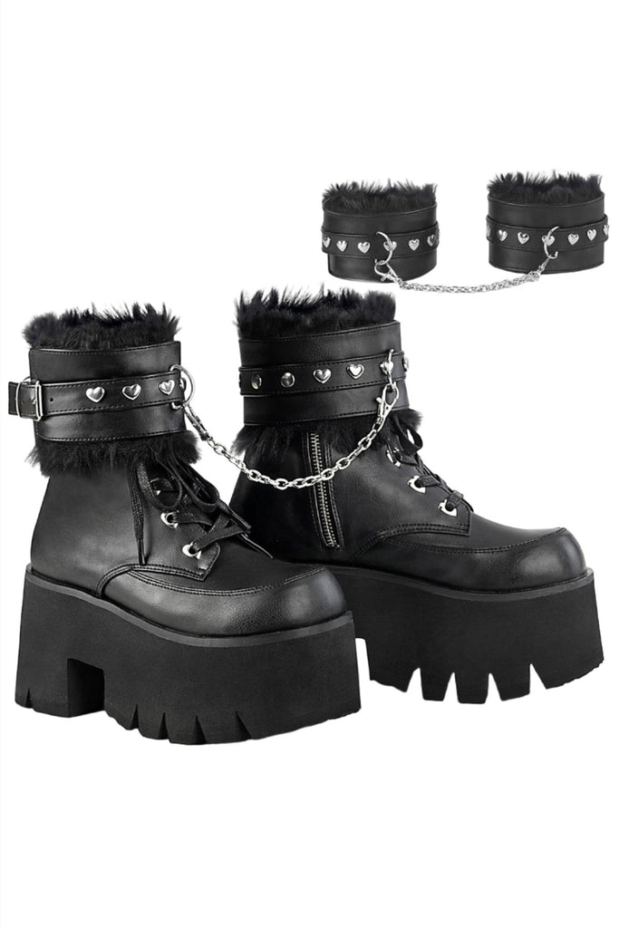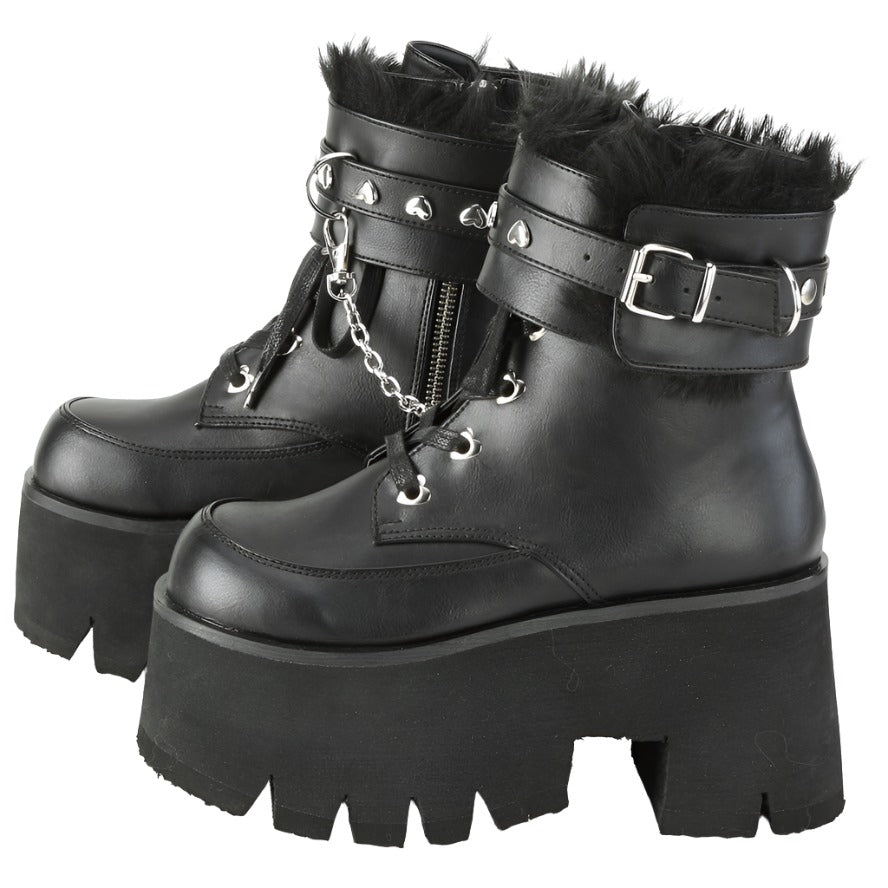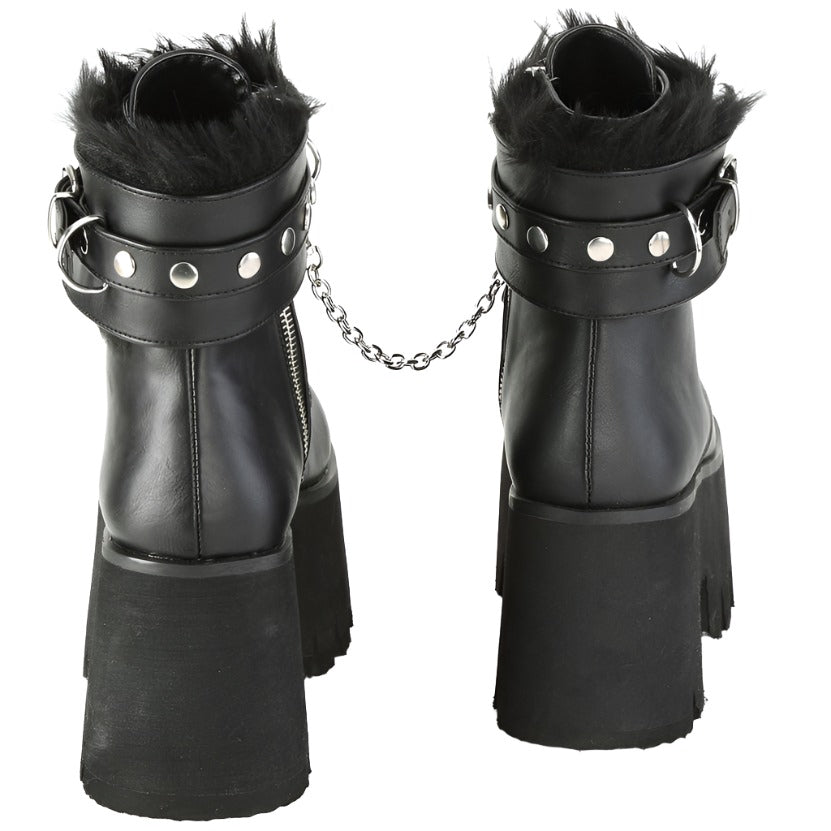 Keywords: DemoniaCult Ashes-57 Boots, Black Boots, Vegan Leather Boots, Ankle Boots, Platform Boots, Chunky Heel Boots, Studded Boots, Chain Boots, Fur Lined Boots, Removable Cuffs, Goth Boots, Punk Boots, Festival Boots, Alternative Fashion Boots, Comfortable Boots, Dark Romantic Style