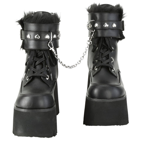 3 1/2" (90mm) Chunky Heel, 2 1/4" (57mm) Cut-Out Platform Heart Eyelet Lace-Up Ankle Boot Featuring Fur Lined Adjustable Removable Ankle Cuffs with Heart Studs, D-Ring and Chain with Swivel Snap Hooks Details, Metal Side Zip Closure.
