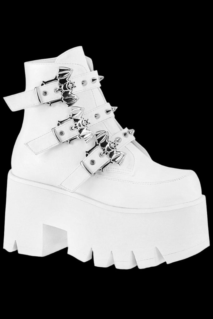 Calling all fashion rebels and alternative spirits! The DemoniaCult ASHES-55 boots in white vegan leather are your gateway to a world of bold individuality. These statement ankle boots are more than footwear; they're a canvas for expressing your unique style and defying fashion norms.