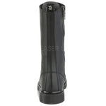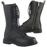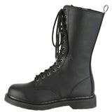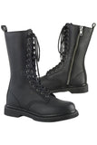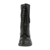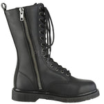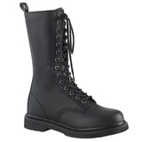 1 1/4" (32mm) Stacked Flat Heel 14-Eyelet Lace-Up Mid Calf Unisex Vegan Boot with Back Pull-Tab, Inside Zip Closure.