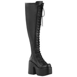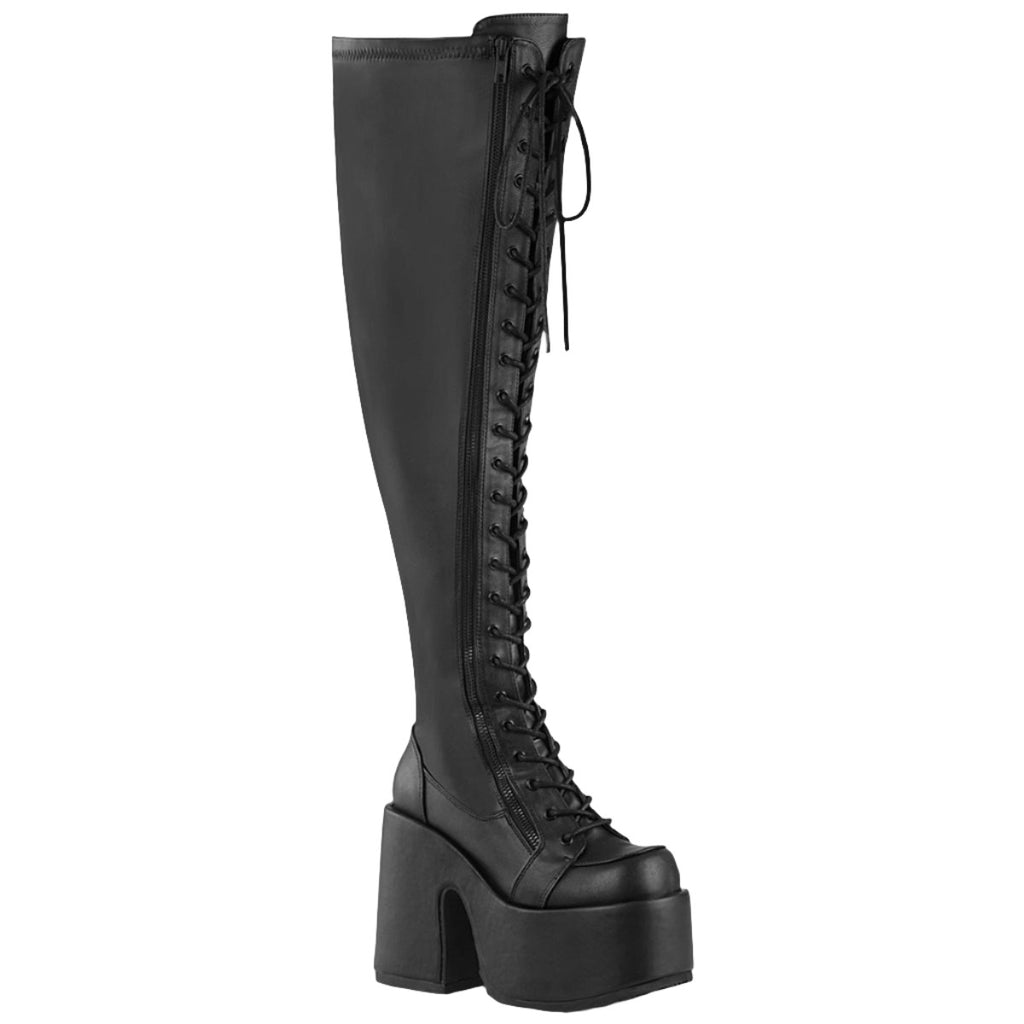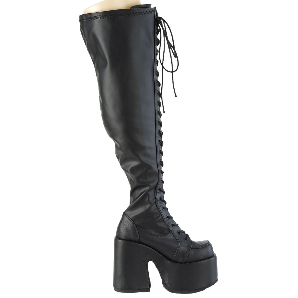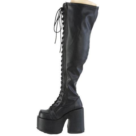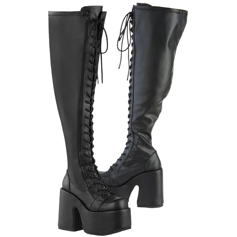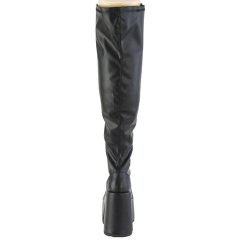 Own your look with the DemoniaCult CAMEL-300WC Wide Calf Boots. These statement thigh-high boots boast a chunky platform sole and a sleek black vegan leather finish, designed to flatter wider calves and elevate your everyday style. Perfect for those who crave a touch of edge and a whole lot of confidence, these boots are ready to take you anywhere you want to go.