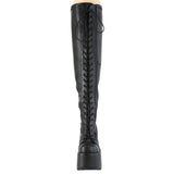 5" (127mm) Chunky Heel, 3" (76mm) Platform Lace-Up Stretch Wide Calf Thigh-High Boot, Full Length Outside Metal Zip Closure.
