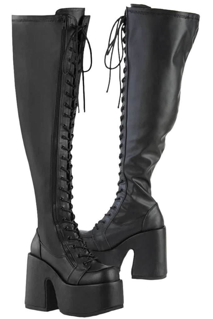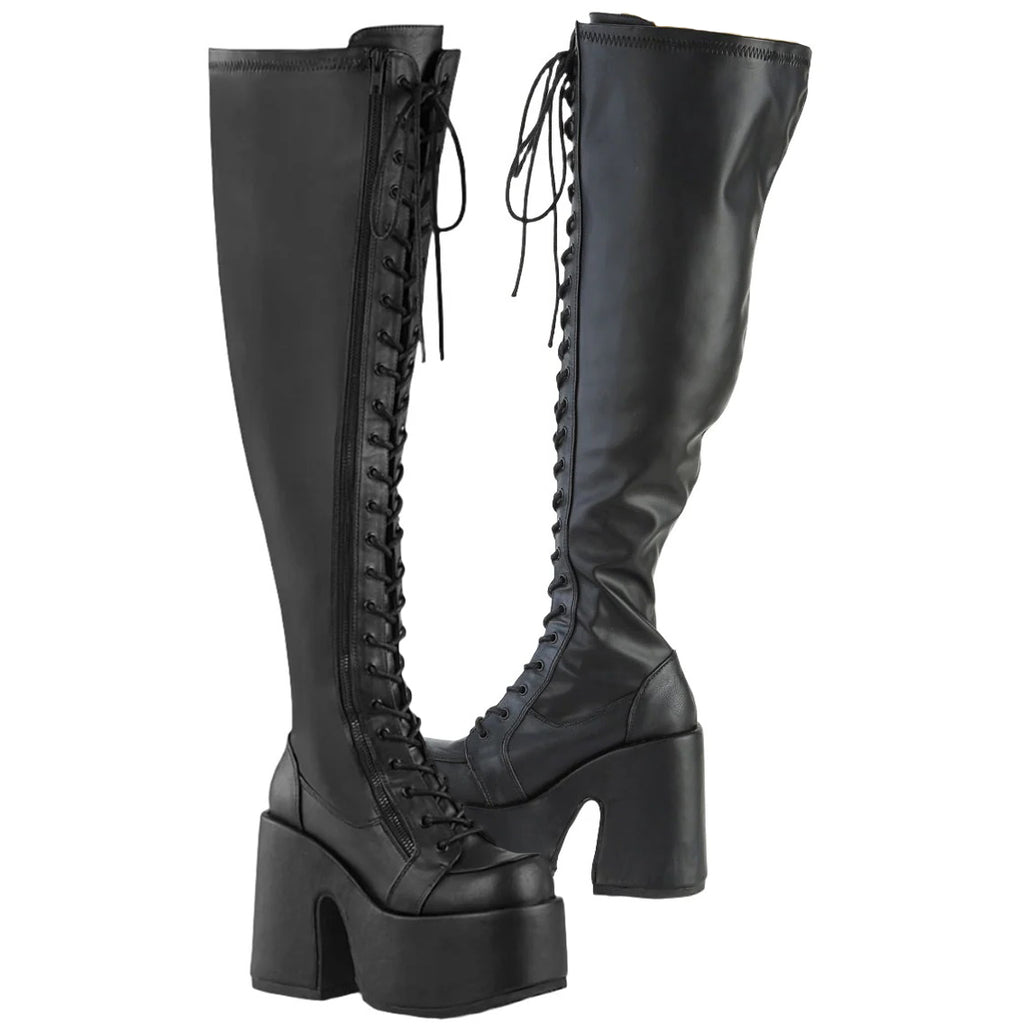 Keywords: DemoniaCult CAMEL-300WC Boots, Black Boots, Vegan Leather Boots, Wide Calf Boots, Thigh High Boots, Platform Boots, Chunky Heel Boots, Lace-Up Boots, Zip Boots, Comfortable Boots, Edgy Boots, Curvy Fashion Boots, Alternative Fashion Boots