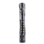 Embrace the spirit of innovation and adventure with the DemoniaCult Crypto 302 Steampunk Boots. These statement knee-high boots boast a chunky platform sole and a captivating black leather and suede effect finish. Steampunk-inspired details like cog eyelets, decorative cogs, and a bee badge create a unique and unforgettable look, perfect for those who crave a touch of Victorian fantasy.