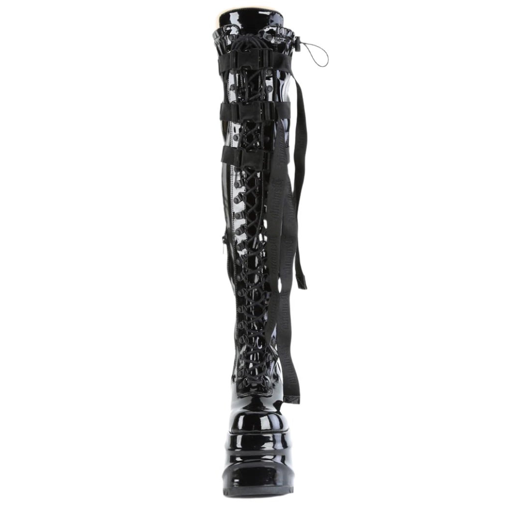 The DemoniaCult WAVE-315 Black Stretch Patent Boots are a surefire way to turn heads. These thigh-high stunners boast a sleek black patent finish, a comfortable stretch design, and a show-stopping 6-inch wedge platform, making them perfect for those who crave a dramatic and daring look.