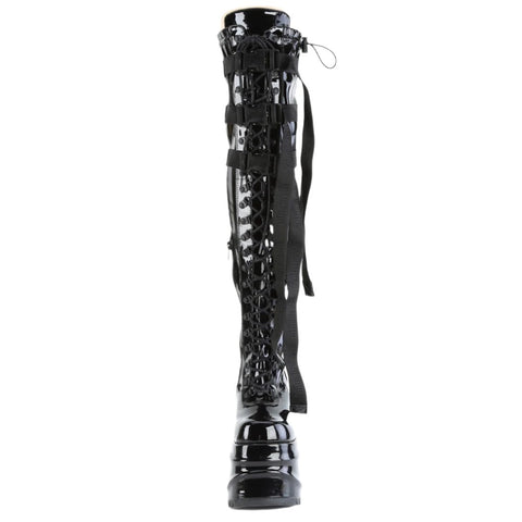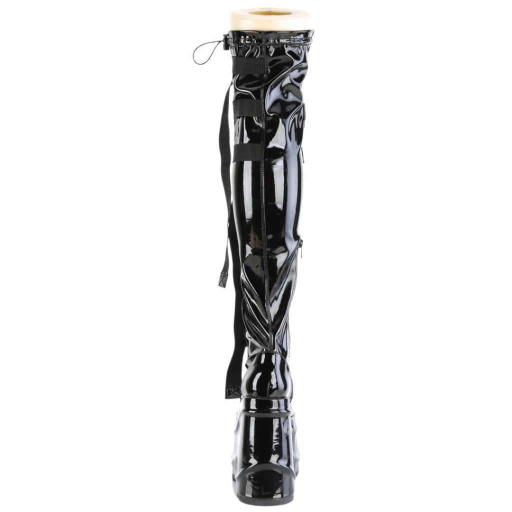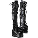 6" (152mm) Wedge Platform Lace-Up Stretch Thigh High Boot featuring 3 Branded Hanging Nylon Straps with Snap Buckles and Elastic Top with Toggle, 1/2 Length Inside Zip Closure.