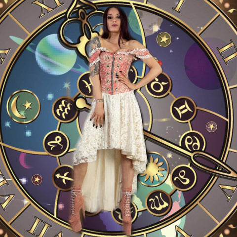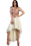 Gypsy high low Victorian gothic corset dress in coral cream jacquard with cream satin lace overlay skirt, front zip and military style silver buttons. The dress has off shoulder straps, laces and modesty panel at rear. Perfect for special occasions.