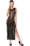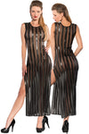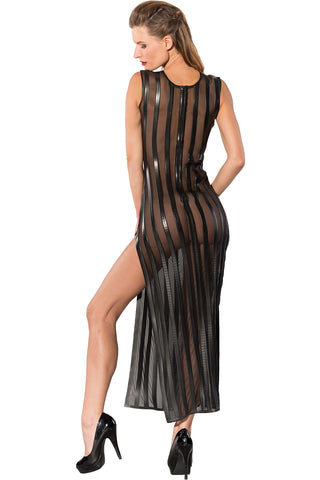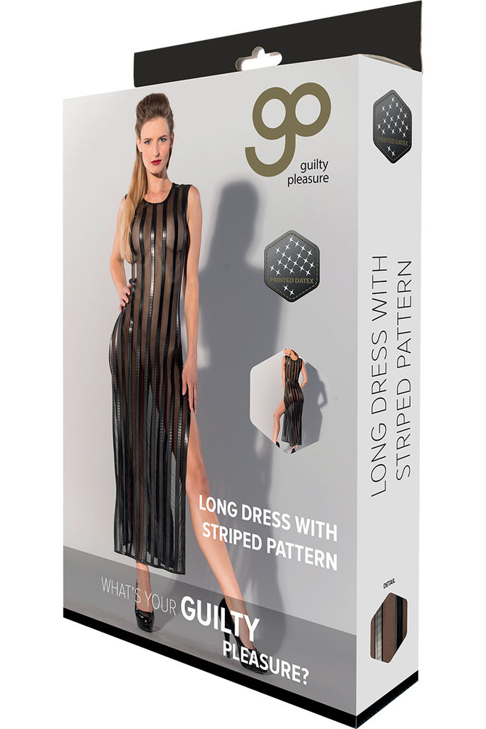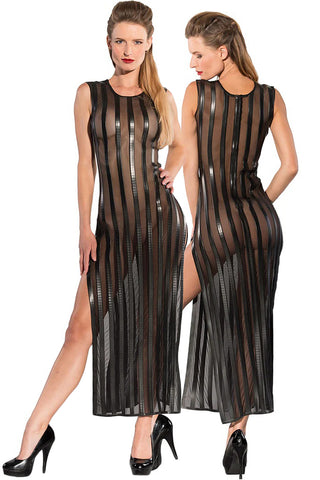 An elegant and sexy statement piece, this Guilty Pleasure Long Datex Dress combines a classic silhouette with a bold, modern design. The dress features wide black latex stripes on a transparent fabric, creating a look that's both alluring and comfortable.