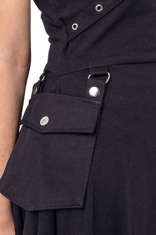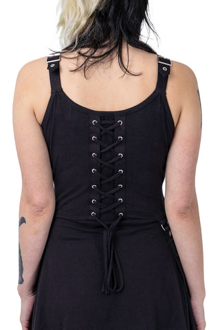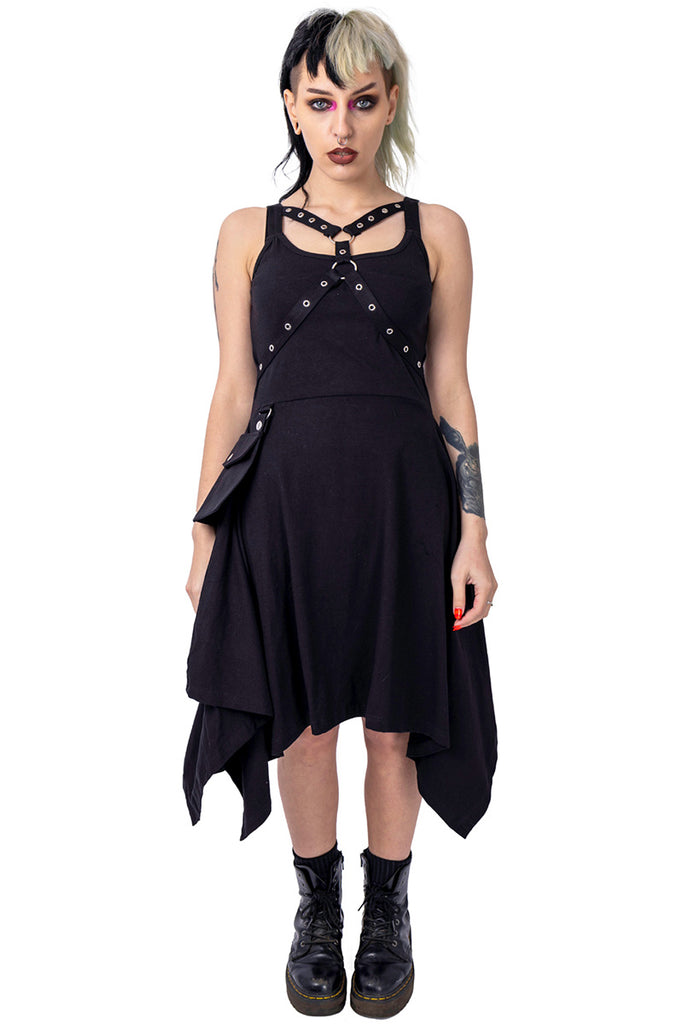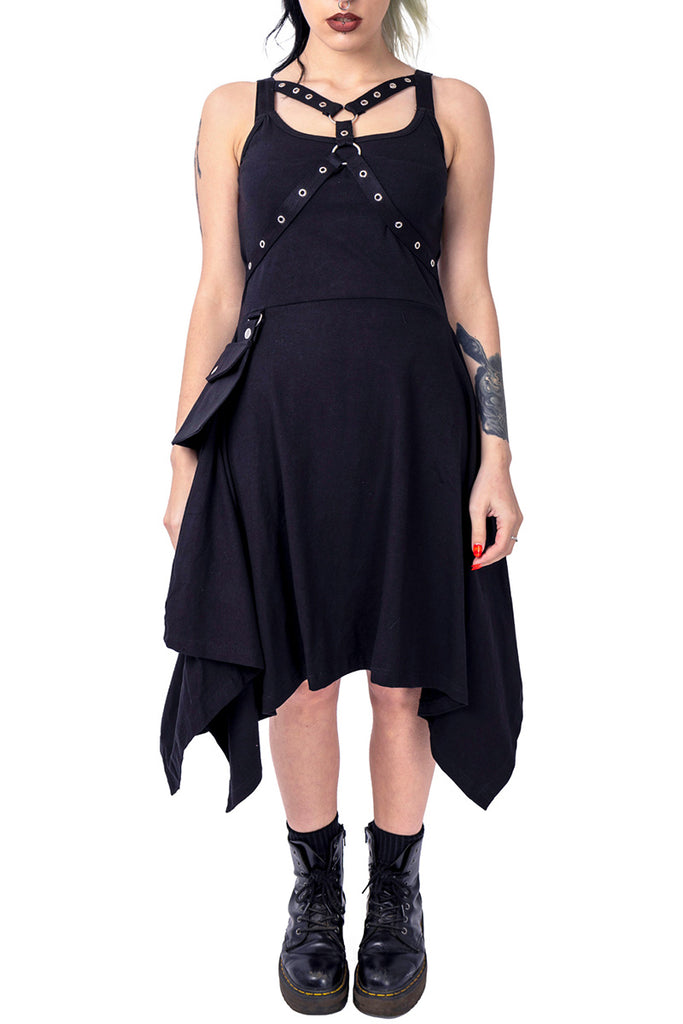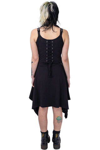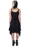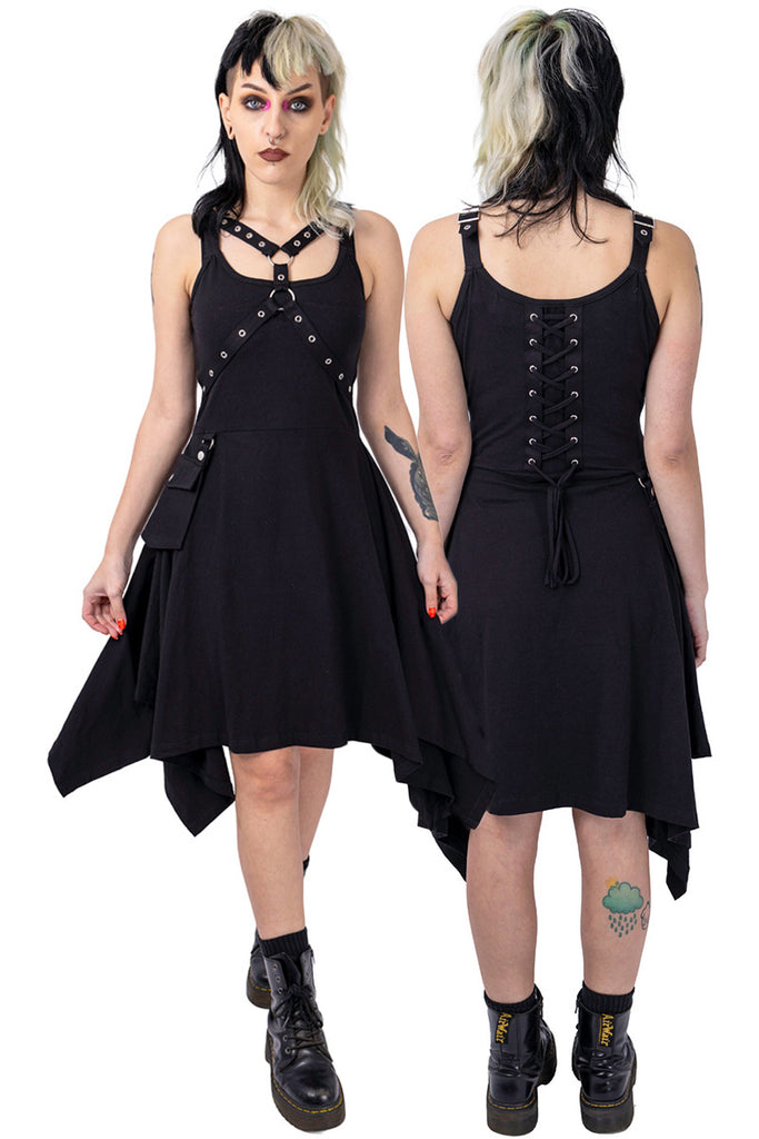 Embrace your dark side with the Heartless Unpleasant Dreams Dress, a captivating blend of gothic elegance and edgy style. This black strappy dress features a flirty hanky hem, perfect for showcasing your legs. The standout feature is the harness-style straps adorned with eyelet detail, creating a striking visual impact across the chest. A decorative corset-style lacing at the back of the waist adds a touch of rebellious charm.