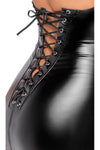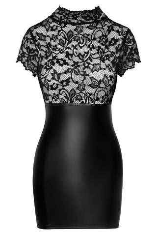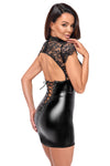 Erotic elegance in an exclusive style! Short, tight dress by Noir in a black, noble material mix of delicate lace (top) and matt shiny powerwetlook (skirt). Soft and stretchy for high wearing comfort. With short sleeves and beautiful stand-up collar and hook fastening at the back. Highly sophisticated back view with open back and variable, open lacing on the skirt from the waist to the bottom.