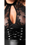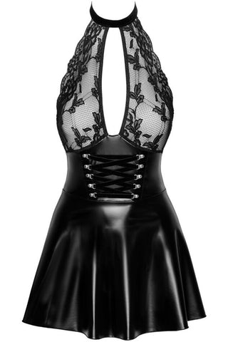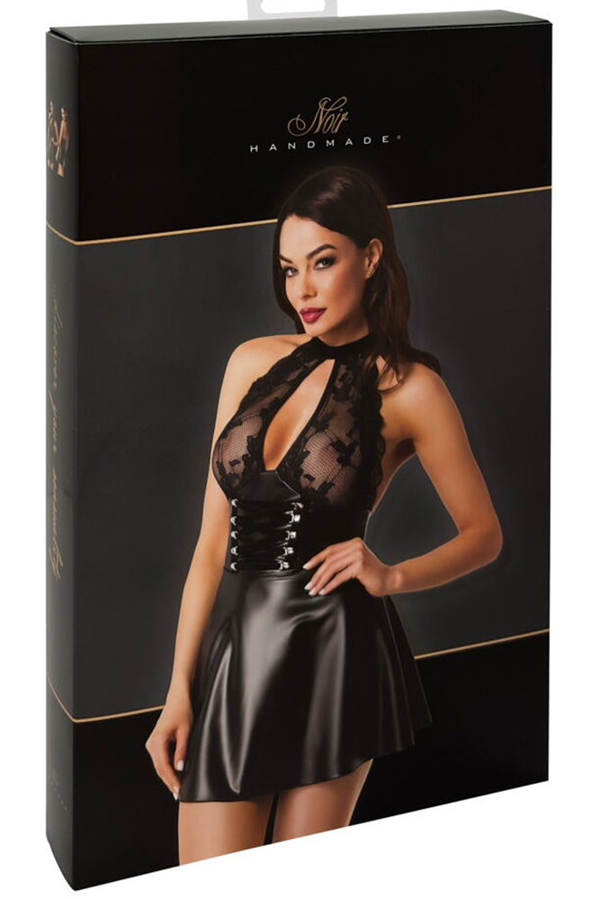An exclusive style in a beautiful mix of materials! The black, strapless and backless mini dress from Noir also has a halterneck. It is made out of beautiful lace (top part) and powerwetlook (flared skirt part). There is an attractive cut-out in the cleavage area. There is decorative lacing around the waist. It is also soft and stretchy for an extremely comfortable fit. The choker halterneck can be adjusted to fit.