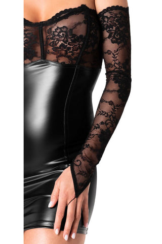 Powerwetlook with a lace top part! The tight-fitting, strapless tube mini dress from Noir is made out of beautiful black powerwetlook with cups that are made out of delicate lace. It is also soft and stretchy which means that it clings to the body in a comfortable way. With a zip at the back. The stretchy lace arm gauntlets with finger loops are included!