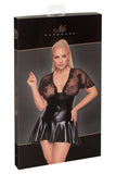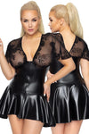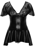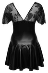 Crafted from luxurious power wetlook, the skirt boasts a flattering flared silhouette that accentuates your curves in all the right places. The bodice is adorned with exquisite tulle, delicately embellished with a captivating velvet flock print, creating a striking contrast. The low-cut neckline and wide, short sleeves add a touch of allure, while the full-length front zip ensures effortless dressing.