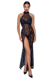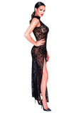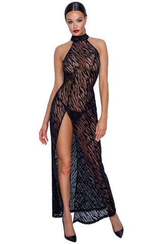 High-neck – but excitingly transparent! Exclusive, ankle-length dress from Noir that is made entirely out of soft and stretchy powernet with a delicate velvet flock print in a tiger design. It clings seductively to curves and is very comfortable at the same time. There is an extra long slit up the front. The stand-up collar is closed at the back of the neck with 3 buttons, the back seduces with an extra large, oval cut-out.